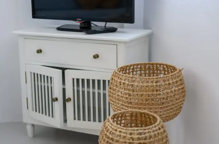 Entering this apartment, you will find a comfortable living room with a cozy sofa and high-tech flat screen TV for your entertainment needs. Additionally, the kitchen is fully equipped with all the necessary stuff.