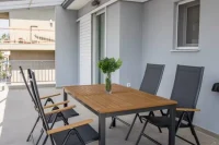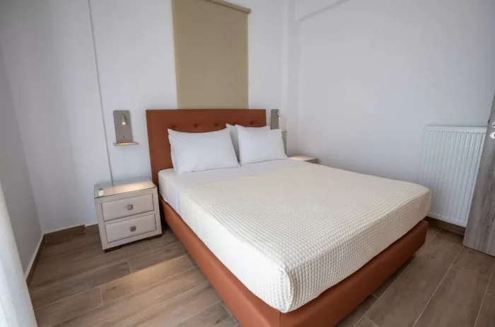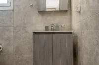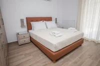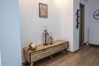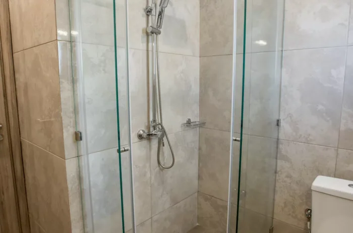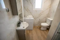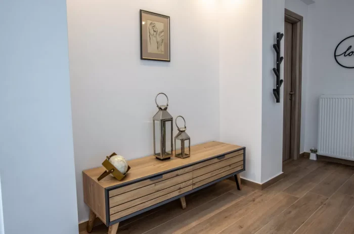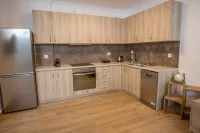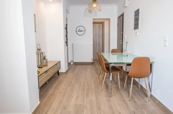 Entering the apartment, you will find a comfortable living room with a cozy sofa, completed with a table & a high-tech flat screen TV for your entertainment needs. Additionally, the kitchen is fully equipped with all the necessary stuff.