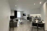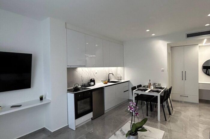 Entering this apartment, you will find a comfortable living room with a cozy sofa and high-tech flat screen TV for your entertainment needs. Additionally, the kitchen is fully equipped with all the necessary stuff.