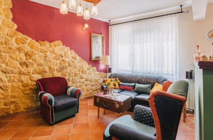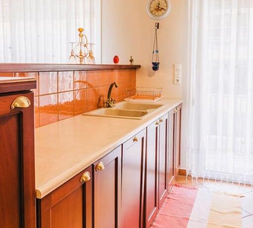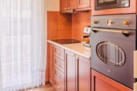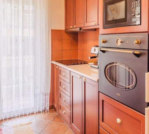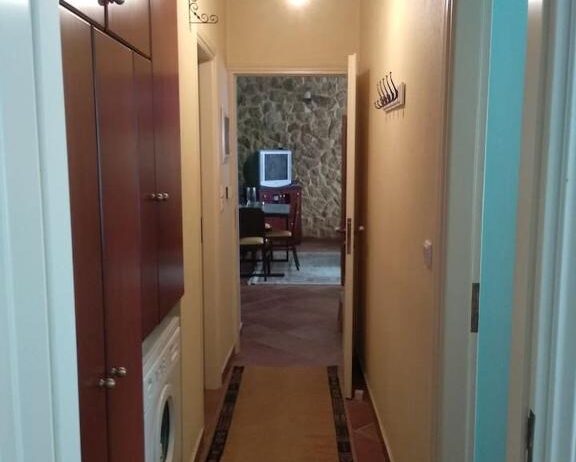 Entering this apartment, you will find a comfortable living room with a cozy sofa and high-tech flat screen TV for your entertainment needs. Additionally, the kitchen is fully equipped with all the necessary stuff.