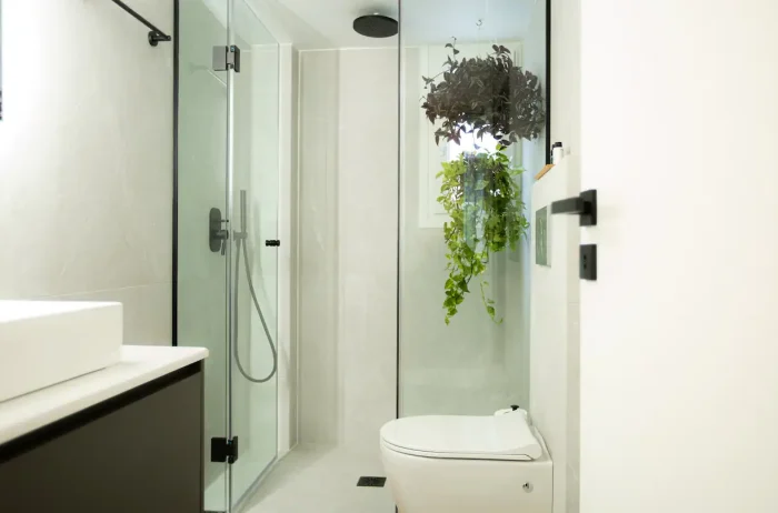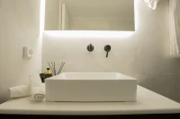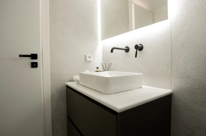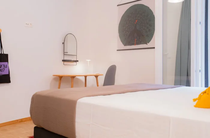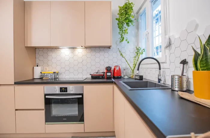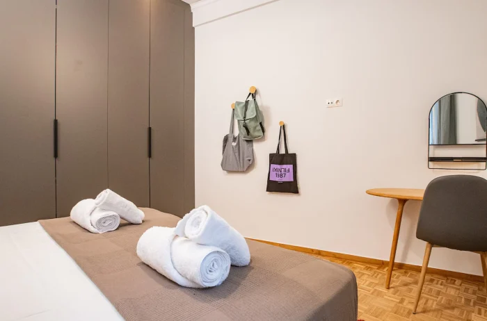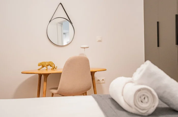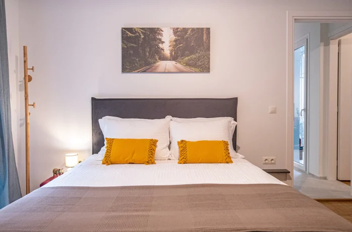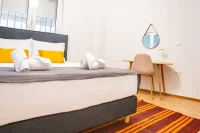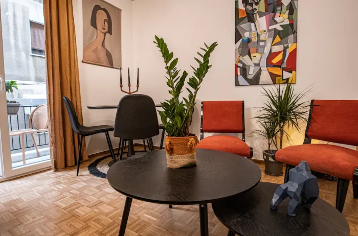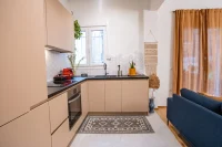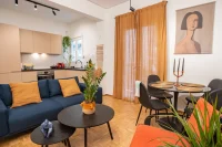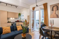 Entering the apartment, you will find a comfortable living room with a cozy sofa and a dining table completed with a high-tech flat screen TV for your entertainment needs. Additionally, the kitchen is fully equipped with all the necessary stuff.