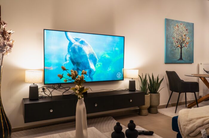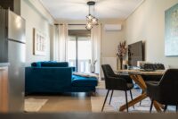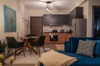 Entering this apartment, you will find a comfortable living room with a cozy sofa and high-tech flat screen TV for your entertainment needs. Additionally, the kitchen is fully equipped with all the necessary stuff.