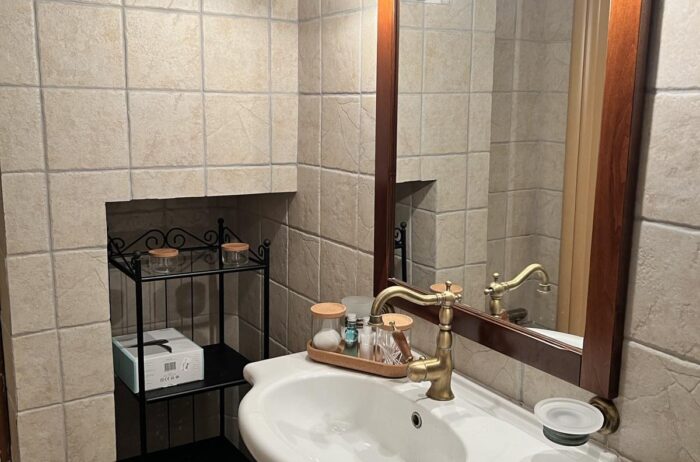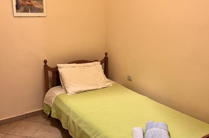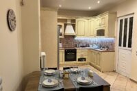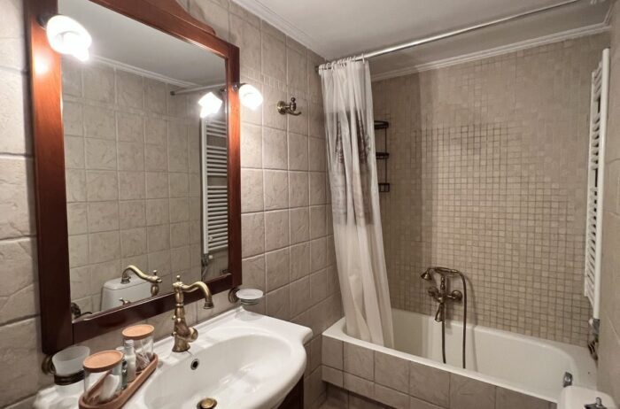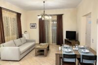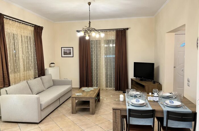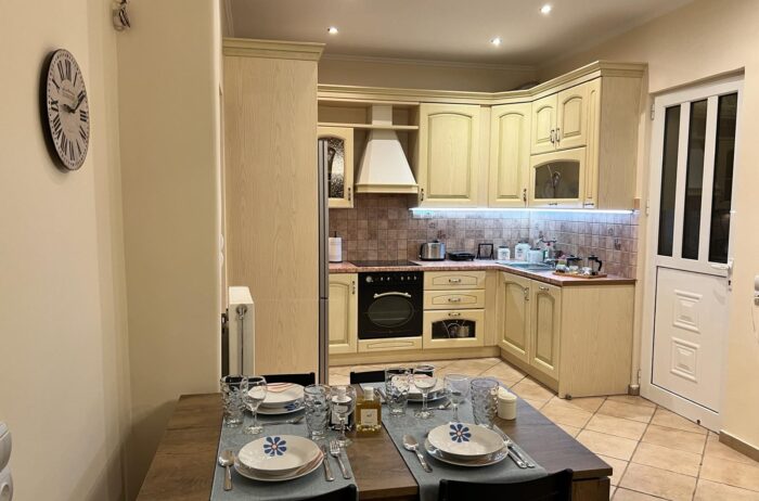 Entering the house, you will find a spacious living room with cozy sofas, completed with a table & a high-tech flat screen TV for your entertainment needs. Additionally, the kitchen is fully equipped with all the necessary stuff.
