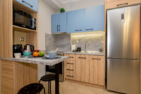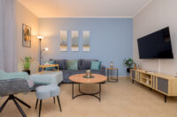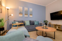 Entering this apartment, you will find a comfortable living room with a cozy sofa and high-tech flat screen TV for your entertainment needs. Additionally, the kitchen is fully equipped with all the necessary stuff.