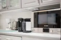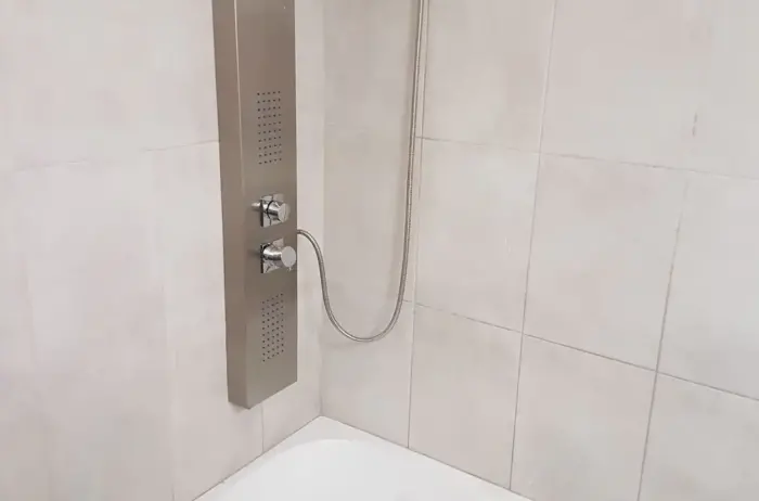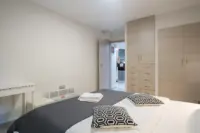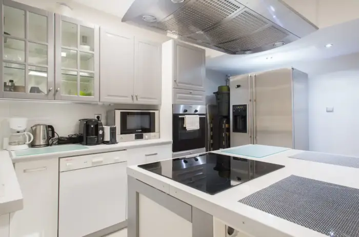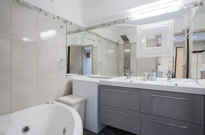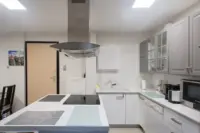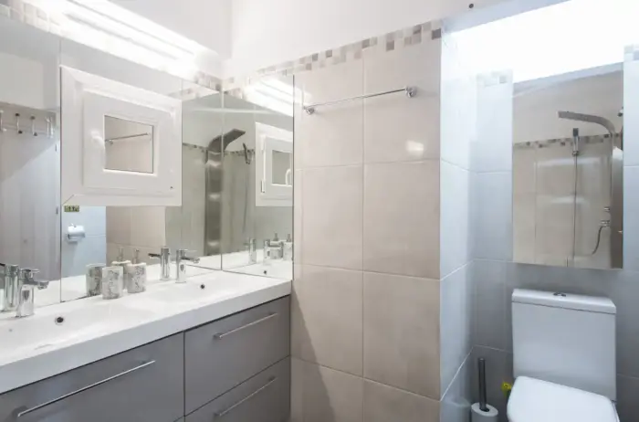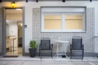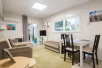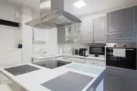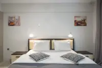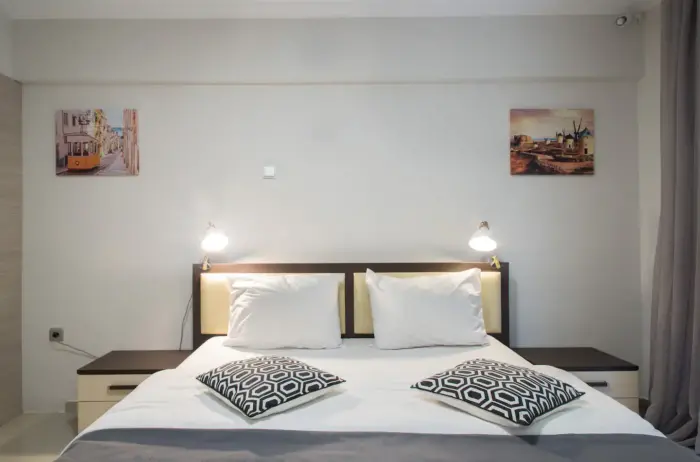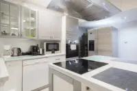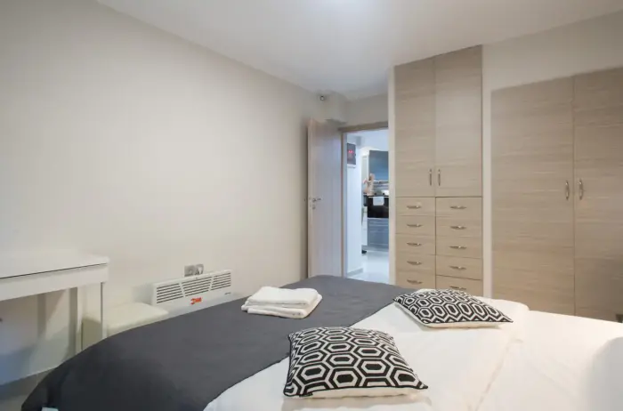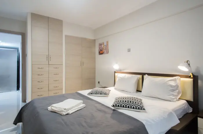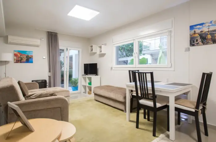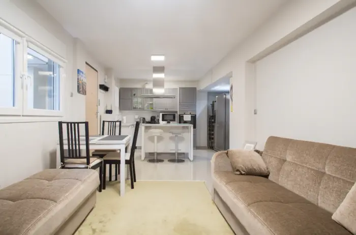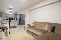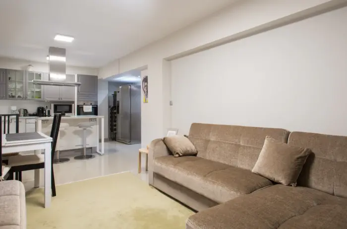 Entering the apartment, you will find a spacious living room with cozy sofas, completed with a table & a high-tech flat screen TV for your entertainment needs. Additionally, the kitchen is fully equipped with all the necessary stuff.