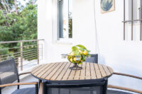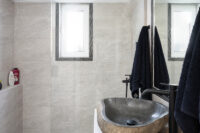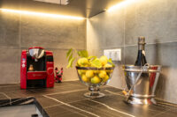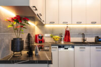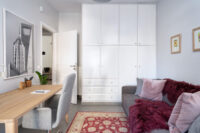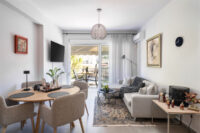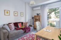 Entering the apartment, you will find a spacious living room with cozy sofas, completed with a table & a high-tech flat screen TV for your entertainment needs. Additionally, the kitchen is fully equipped with all the necessary stuff.