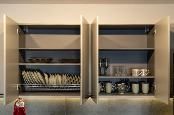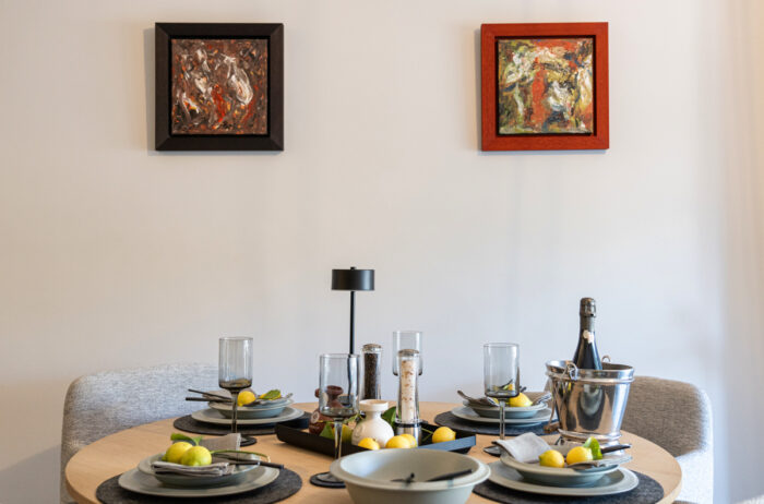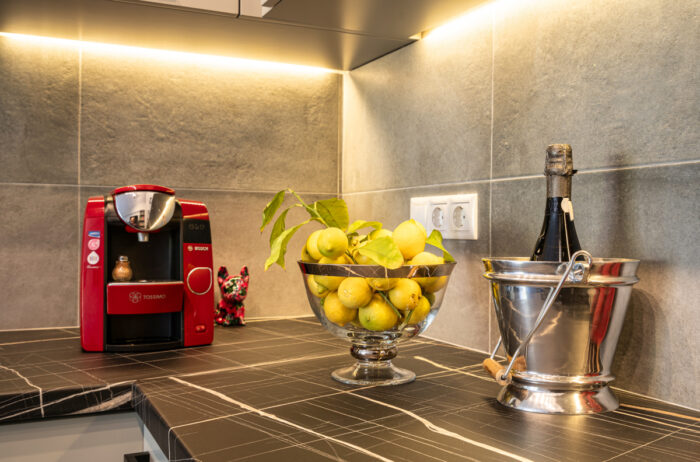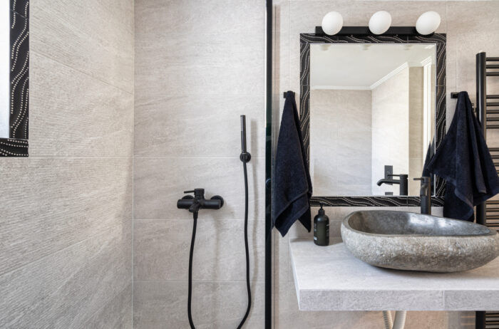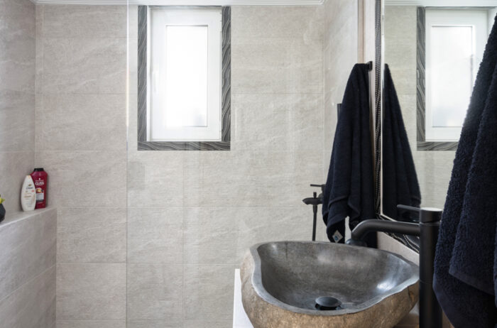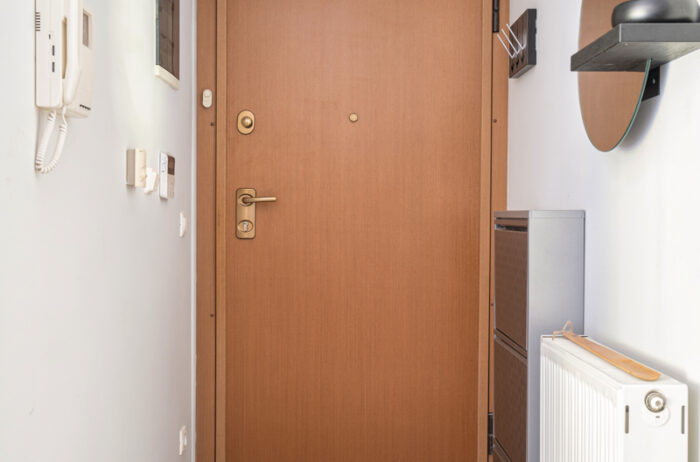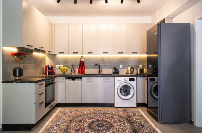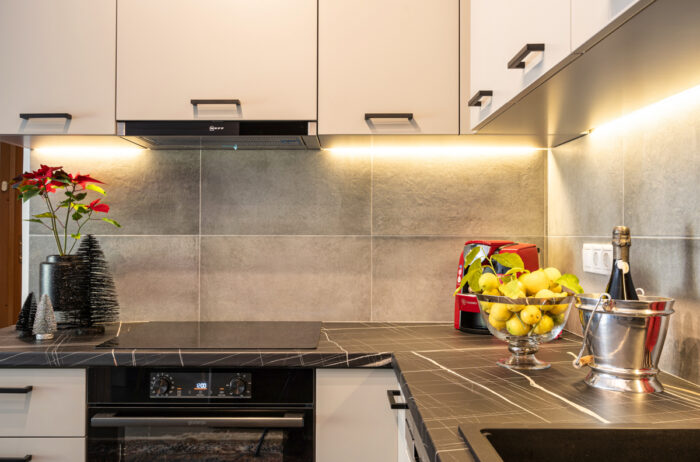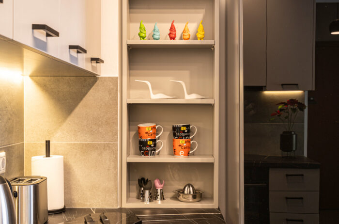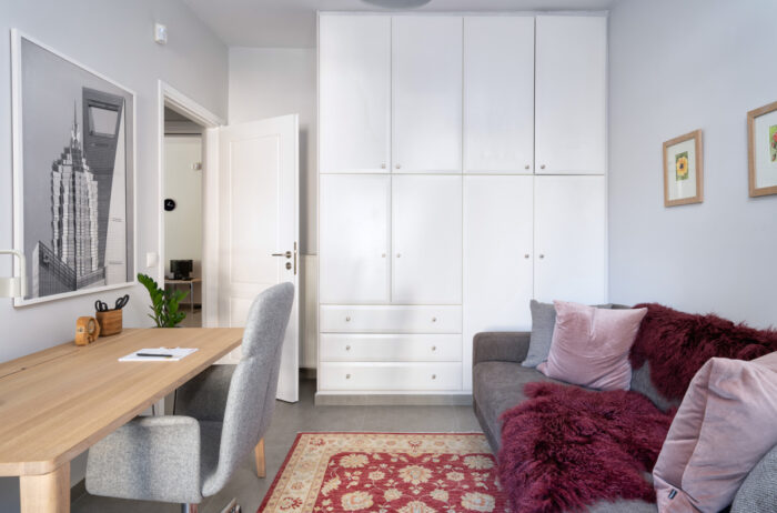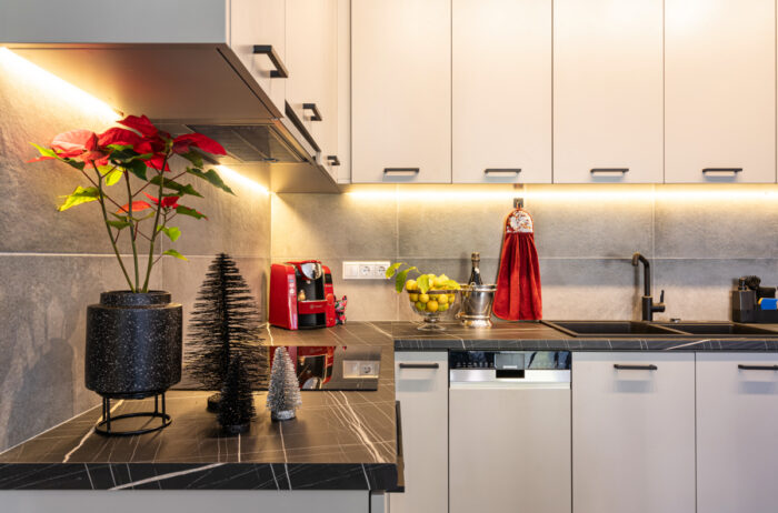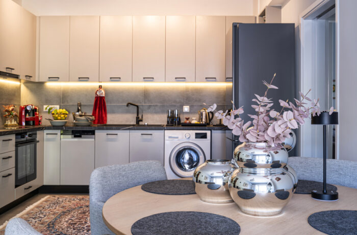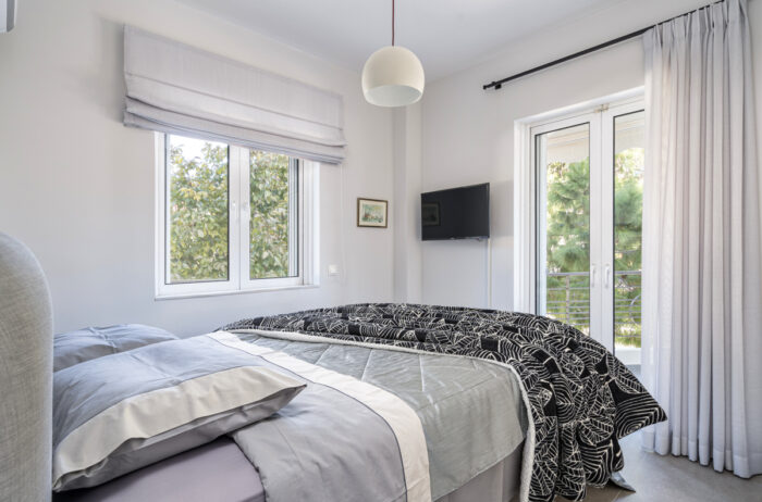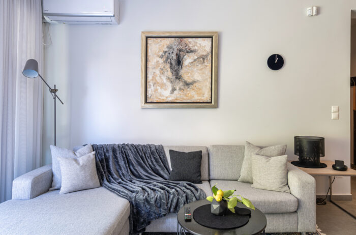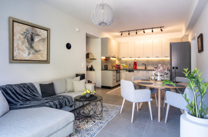 Entering the apartment, you will find a spacious living room with cozy sofas, completed with a table & a high-tech flat screen TV for your entertainment needs. Additionally, the kitchen is fully equipped with all the necessary stuff.