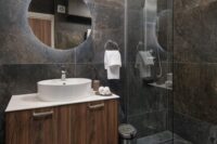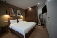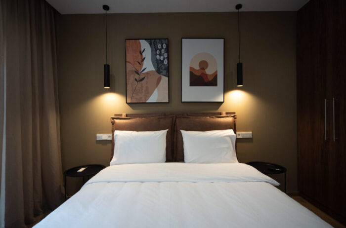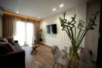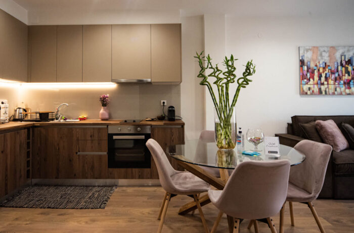 Entering this apartment, you will find a comfortable living room with a cozy sofa and high-tech flat screen TV for your entertainment needs. Additionally, the kitchen is fully equipped with all the necessary stuff.