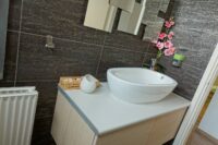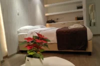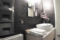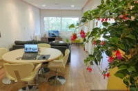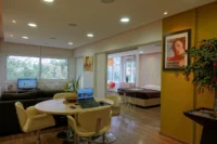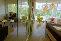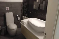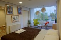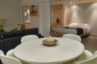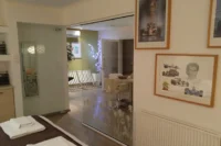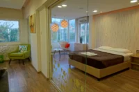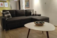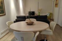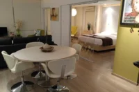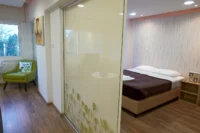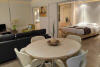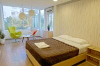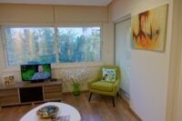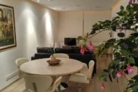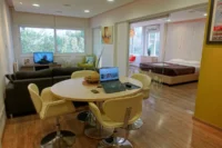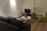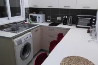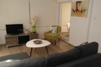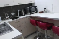 Entering this apartment, you will find a comfortable living room with a cozy sofa and high-tech flat screen TV for your entertainment needs. Additionally, there is a large fully equipped kitchen for all your needs.