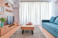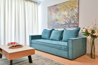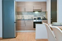 Entering this apartment, you will find a comfortable living room with a cozy sofa and high-tech flat screen TV for your entertainment needs. Additionally, the kitchen is fully equipped with all the necessary stuff.