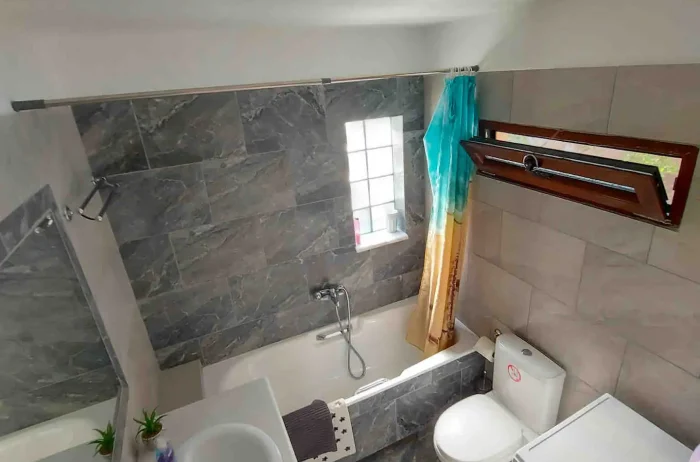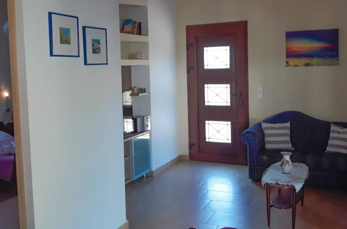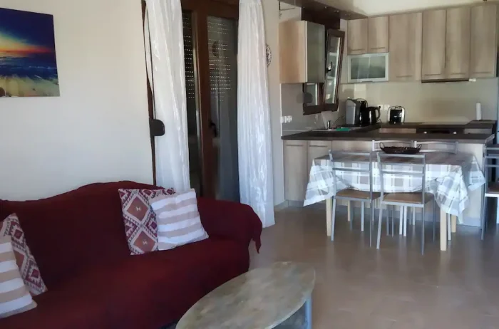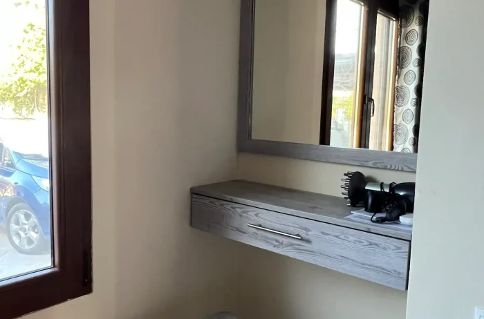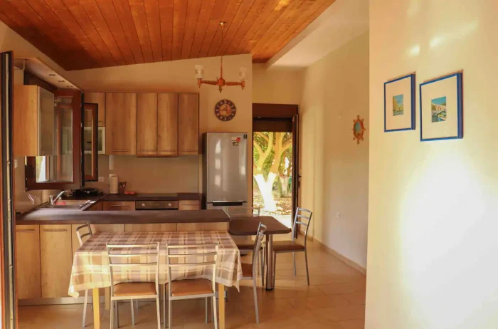 Entering the house, you will find a comfortable living room with a cozy sofa, completed with a table & a high-tech flat screen TV for your entertainment needs. Additionally, the kitchen is fully equipped with all the necessary stuff.