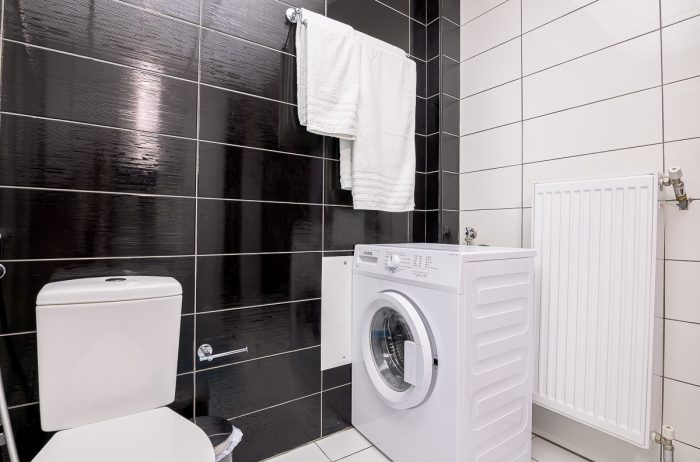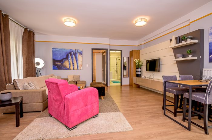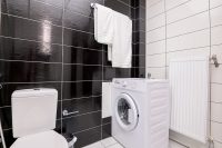 Entering this apartment, you will find a comfortable living room with a cozy sofa and high-tech flat screen TV for your entertainment needs. Additionally, the kitchen is fully equipped with all the necessary stuff.