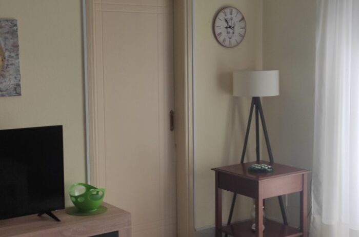 Entering this apartment, you will find a comfortable living room with a cozy sofa and high-tech flat screen TV for your entertainment needs. Additionally, the kitchen is fully equipped with all the necessary stuff.